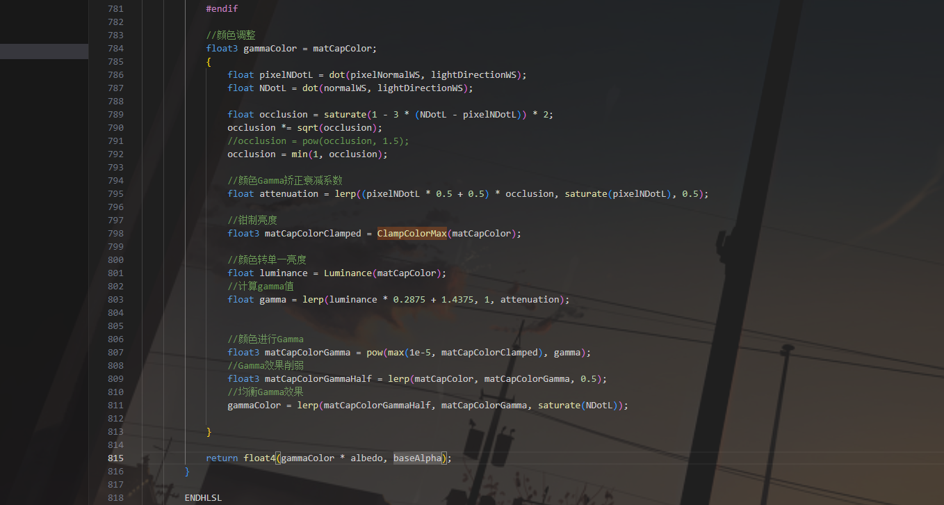 这里Luminance()函数是根据权重计算颜色的灰度(亮度)值。最终通过灰度值来控制Gmma值基数,使用颜色Gamma矫正衰减系数混合,这里这个乘 0.2875和加1.4375的操作也属于经验值,并不是固定的,以效果为准