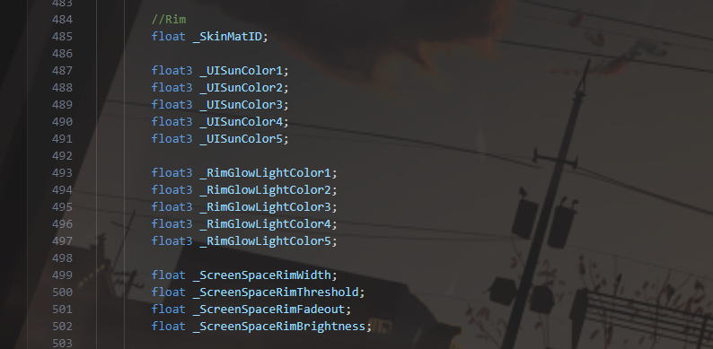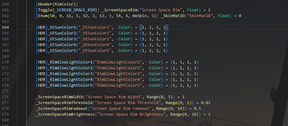 对应的分别为屏幕空间高光开关,皮肤ID,光源颜色,边缘光染色,屏幕空间下边缘光宽度,阈值,衰减程度,强度