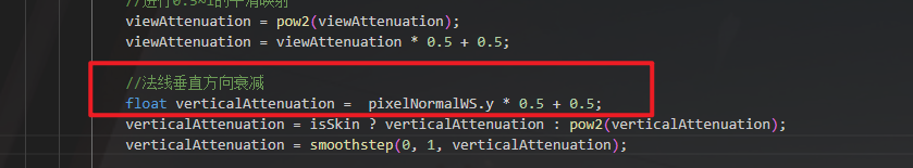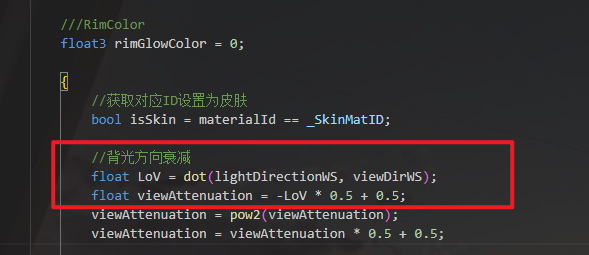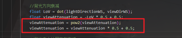 因为边缘光是根据视线方向和灯光方向来控制的,比如说背光的时候边缘光会很强,而面光面就比较弱。所以先计算LOV 这里对(-LOV)进行了重映射,映射到0~1,这里注意是(-LOV),因为LOV根据点乘特征同向为一反向为-1,所以面光面为1,背光面为-1,而边缘光应该以背光面为主,所以取(-LOV)计算,得到viewAttenuation
