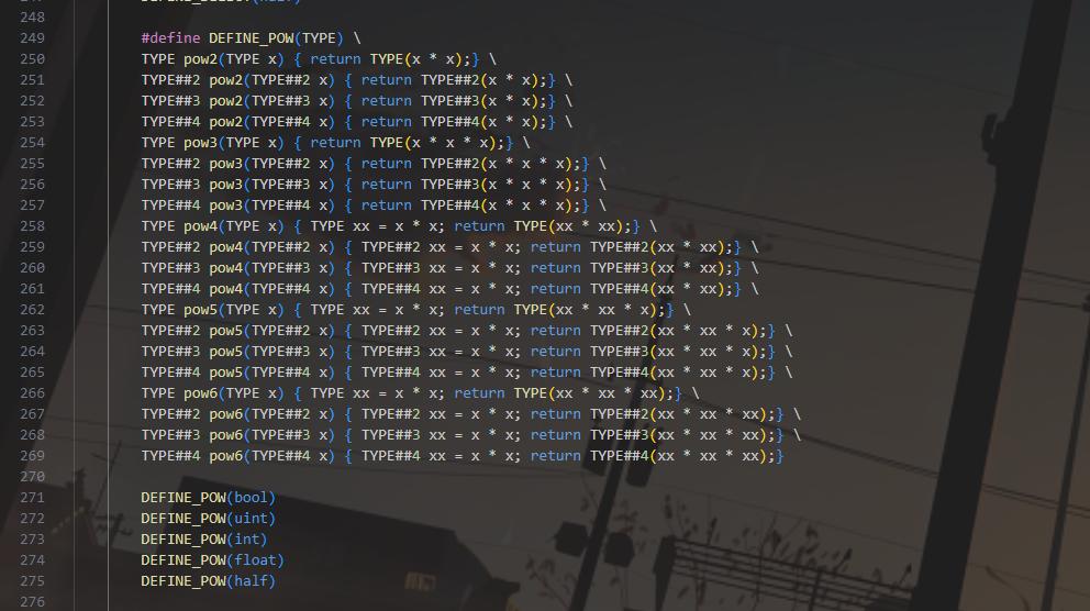 TYPE##3 pow5(TYPE##3 x) { TYPE##3 xx = x * x; return TYPE##3(xx * xx * x);} \