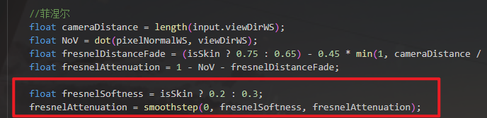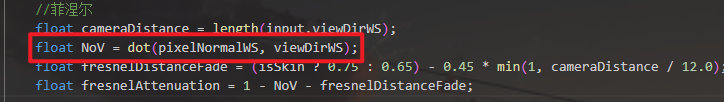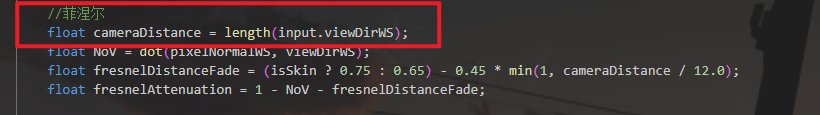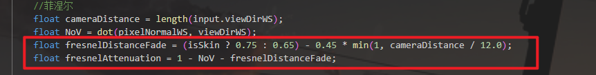 对皮肤进行判断,皮肤的菲涅尔效果应该比衣服更弱,所以被(1-NOV)减去的值应该更多,然后衰减程度也和相机距离相关,min(1, cameraDistance / 12.0)最大值为1,当相机距离为12米时为最大,这里12.0就是相机距离,综合起来看就是随距离越远,菲涅尔强度略微增强(其实肉眼看不太出来)