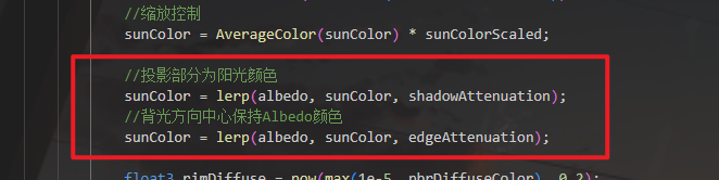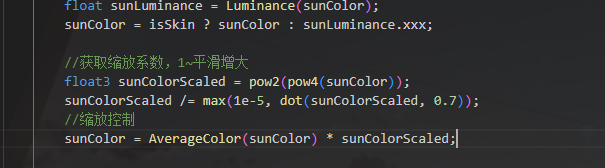 这里对阳光强度控制,先对基础颜色进行压制将颜色尽量压制到暗部,然后进行不完全的归一化,这里是对暗处提亮,而亮的地方进行压制防止过曝,前面进行压制过后暗处的地方相当于变多了,那么暗部细节就会提亮。这里其实是计算平均整体亮度,但是为了保证有一定明暗关系,所以取了0.7而不是1