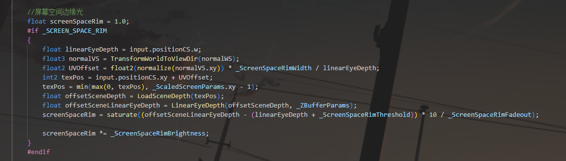 这里添加了屏幕空间的边缘光,和计算投影是一个原理,采样偏移的深度图与原深度图进行相减。计算最后就是乘上一个强度系数控制